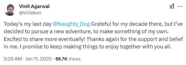 Vinit Agarwal在顽皮狗工作了10年,参与了《最后的生还者2》《神秘海域:失落的遗产》《神秘海域4》等游戏的开发工作。他没有说明离开顽皮狗的原因,以及接下来的去向。