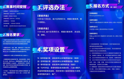 本次大赛面向全国范围开放征集,鼓励参赛者在作词、作曲、编曲或演唱中至少一个环节使用AI工具,风格不限、形式多元。鼓励参赛者熟练运用市场上成熟AI技术平台,也支持相关团队使用自主开发平台参与,发掘“AI + 人类”协同创作的潜力。这不仅为音乐创作者提供了全新的创作思路和工具,也为人工智能在音乐领域的应用开辟了新的道路。通过这场大赛,我们有望见证更多突破传统音乐创作模式的作品诞生,推动音乐行业向智能化、创新化方向发展。
