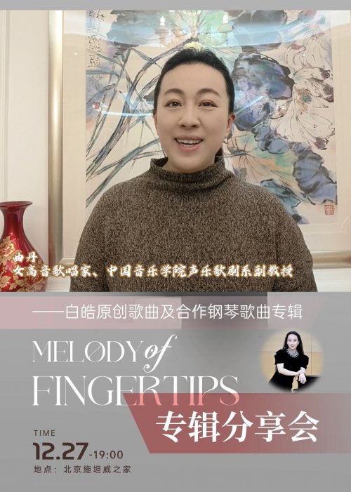 12月27日19时,合作钢琴家白皓将携原创专辑《指尖的旋律》在北京施坦威之家举办专辑分享会,现场呈现其原创歌曲及合作钢琴歌曲作品,多位特邀艺术家将同台助阵。