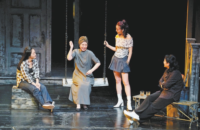 北京人艺话剧《小郡之秋》剧照,龚丽君饰演的母亲(左二)与陈小艺(右一)、张培(左一)、原雨(右二)饰演的三个女儿在一起。记者 方非摄