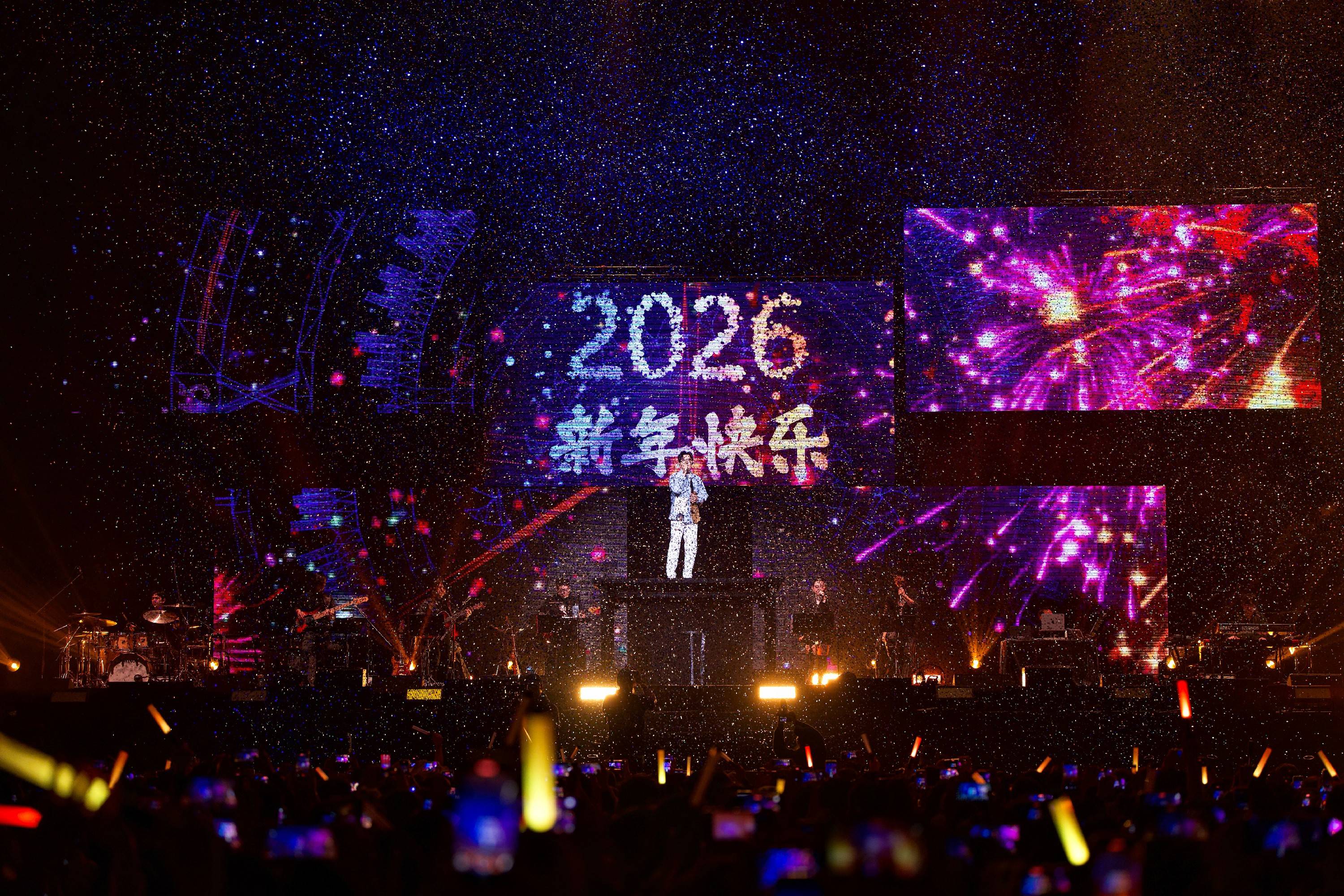本场演出作为品冠首次个人跨年演唱会,特别设计了惊喜跨年环节。在《不如我们今天见》的副歌部分,品冠打趣称:“现在接近阿德莱德时间的零点,大家可以先和我倒数跨年,记得拍下来,然后等北京时间快零点了再同步播放。”随着倒数的呐喊声,舞台大屏同步切换倒计时数字,最终定格在“2026新年快乐”,场面温馨。品冠感性发言:“谢谢你们还愿意来到这里,陪彼此走到这一刻,如果今年你觉得有遗憾,一定要让它留在今天;如果今年你心中有很多的感谢,请紧紧放在心里。我希望我们能好好生活,好好爱人,好好珍惜自己,谢谢你们。”除了真挚的歌声,品冠也三十年如一日用真心对待每一位粉丝。