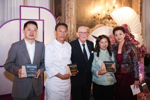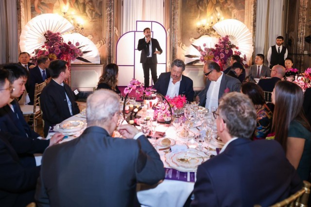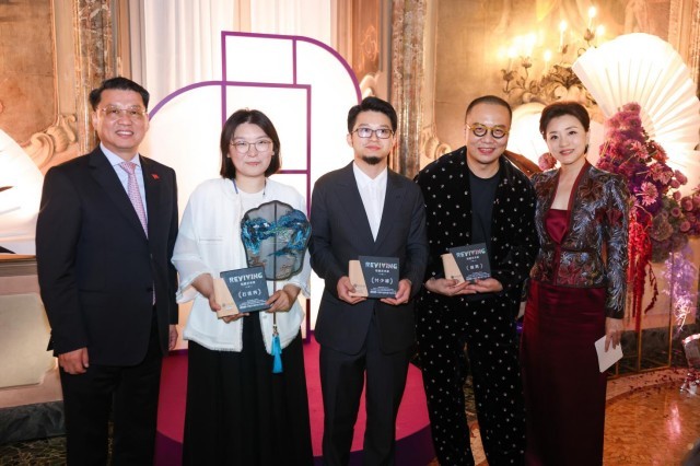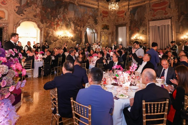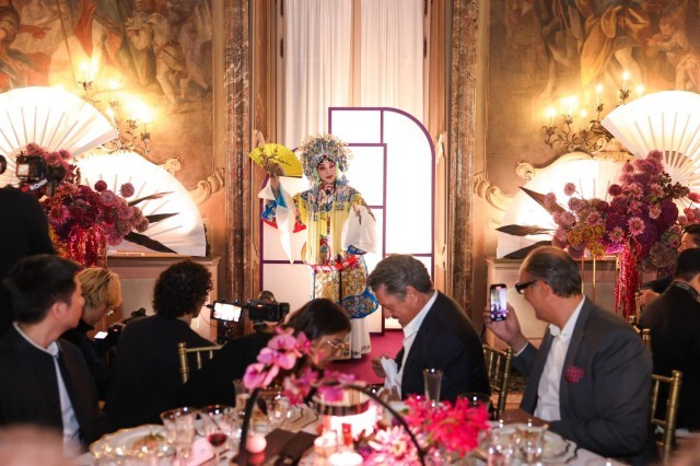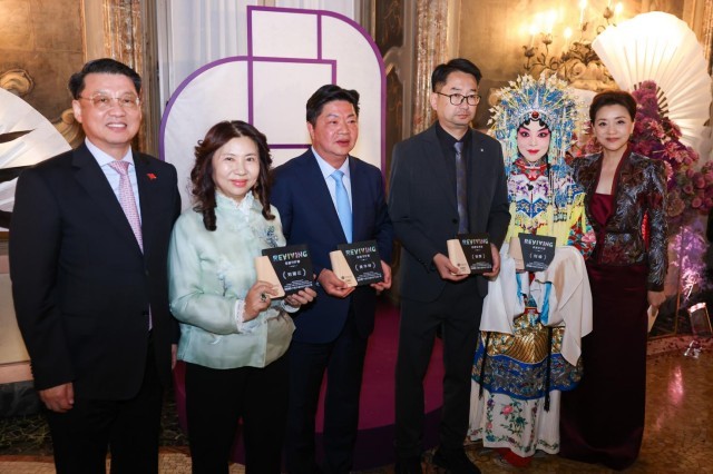 当地时间10月3日晚,意大利米兰维斯康蒂宫华灯璀璨,2025“新生万物——中国非遗与当代设计展”(以下简称“新生万物米兰展”)中意文化之光晚宴在此举行。阳光媒体集团董事长、“新生万物”系列展览联合策展人杨澜,中华人民共和国驻米兰总领事刘侃,意大利中国理事基金会主席马里奥·博塞利(Mario Boselli),世界知名电影与舞台美术指导、服装设计师和视觉艺术家叶锦添等来自中意两国政要、文化、商业、艺术与时尚等领域的代表齐聚一堂,在这场融美食、美酒、京剧、歌剧、非遗表演等多重艺术的文化盛筵中,感受中国非遗的当代魅力与创新表达。